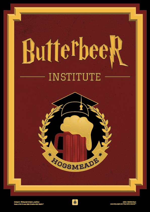 La composition s’organise autour d’une structure centrale emblématique, inspirée des blasons et des insignes universitaires. Au cœur de l’image, une chope de butterbeer stylisée devient le symbole principal. Elle est encadrée par une couronne de laurier et surmontée d’une toque académique, associant ainsi l’idée de savoir, de réussite et de tradition à cet élément emblématique.