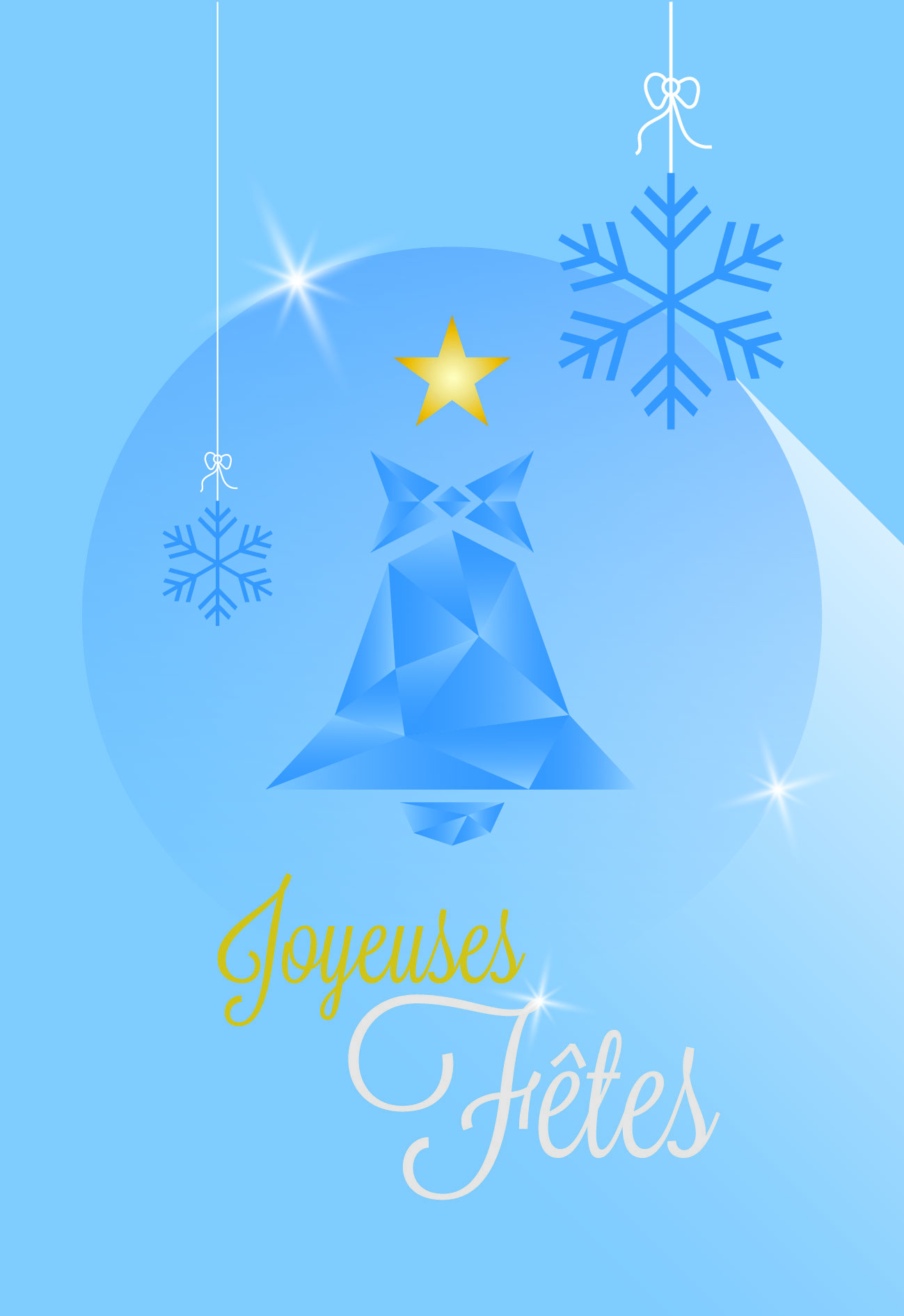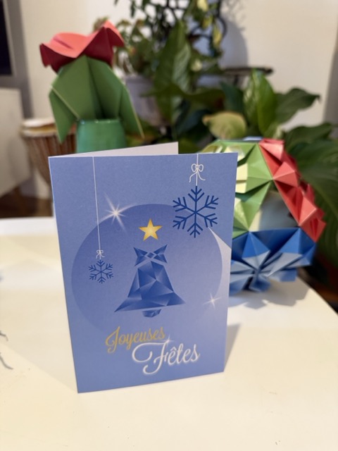 Symbole de célébration et de rassemblement, la cloche prend ici une allure graphique et moderne sur cette carte à 2 volets. Sur fond bleu, elle évoque l’hiver, les fêtes et ce petit moment suspendu où l’on prend le temps d’écrire aux autres.