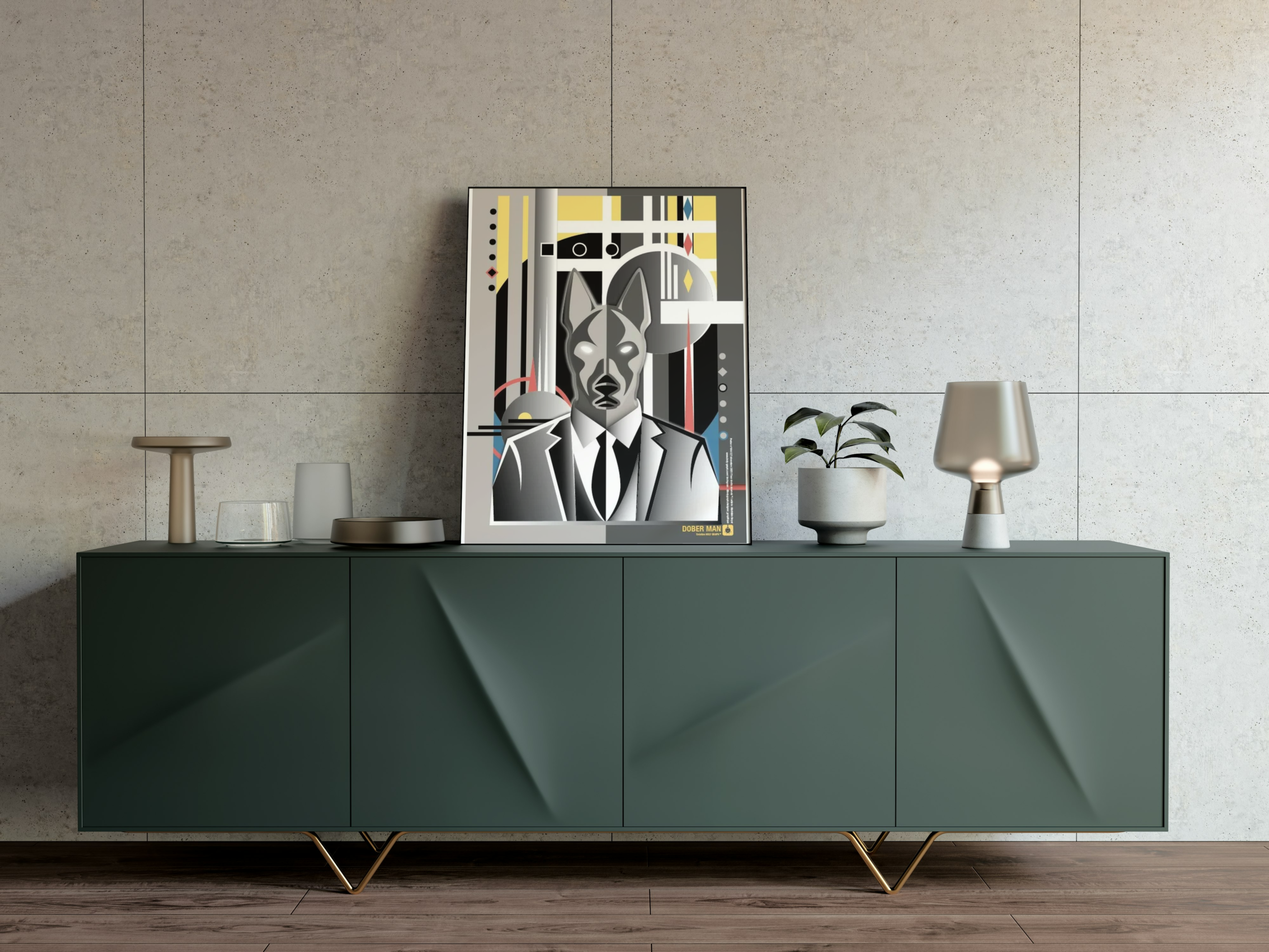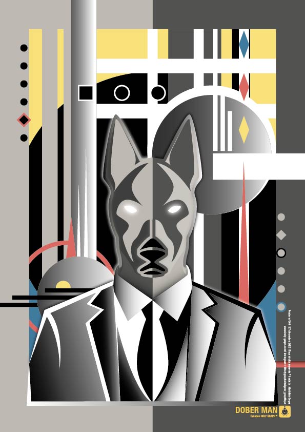 Cette composition s’appuie sur une approche graphique où la rigueur géométrique rencontre une figure symbolique forte. Au centre de l’image, un personnage hybride — mi-homme, mi-doberman — est traité comme une icône visuelle. Son visage symétrique et stylisé agit comme un point d’équilibre dans une architecture graphique dense et structurée.