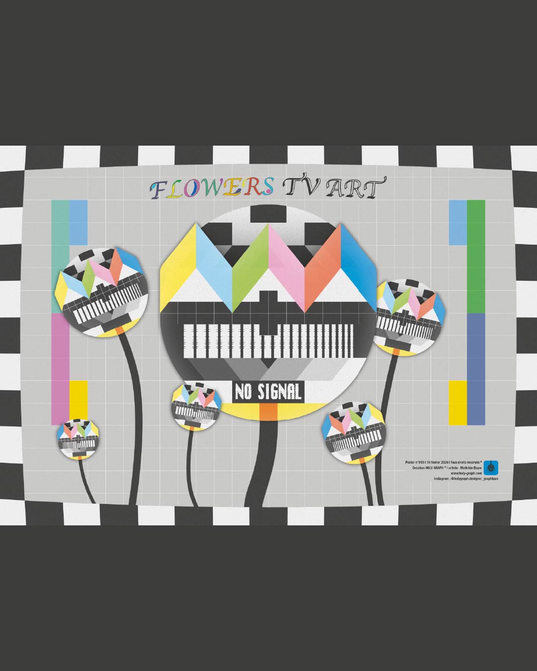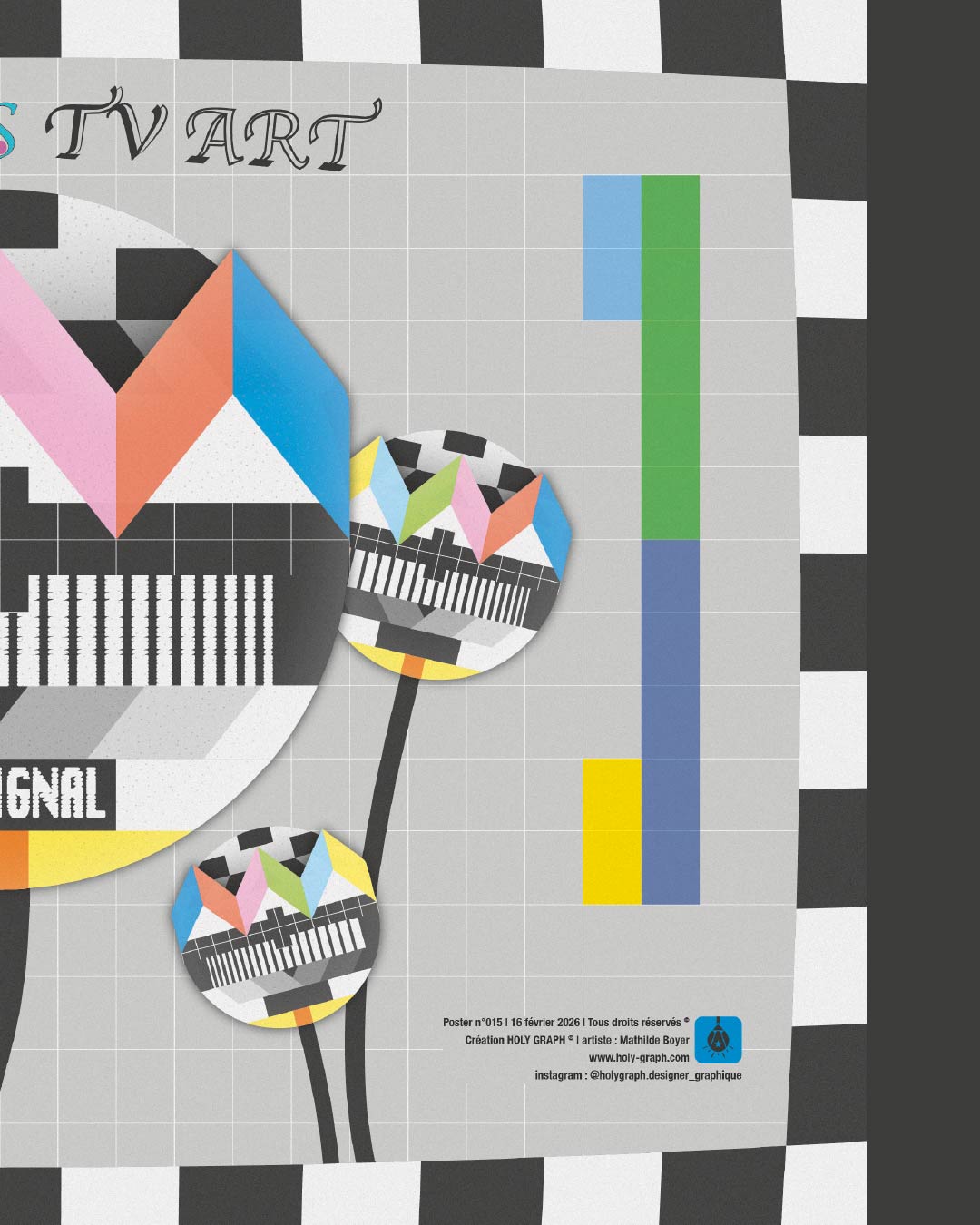 Cette composition graphique revisite l’esthétique des mires télévisuelles analogiques en la transformant en un paysage visuel organique. Ce poster explore la frontière entre technologie, mémoire visuelle des écrans et interprétation graphique poétique.