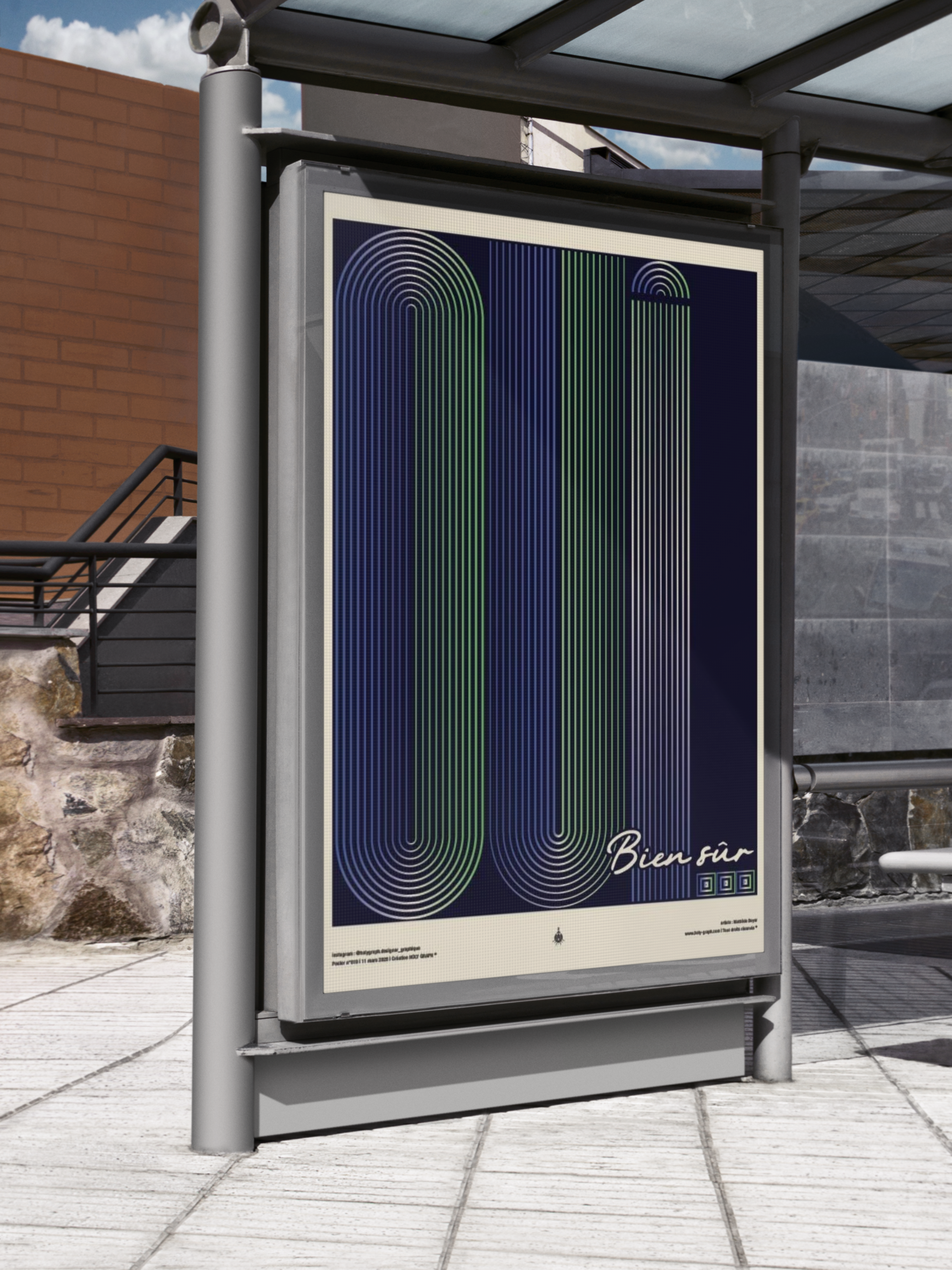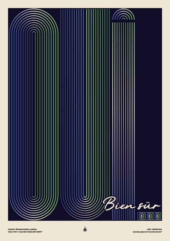 Ce poster explore la puissance expressive de la ligne répétée comme élément fondateur de la composition graphique. Le mot « Oui » devient ici une structure visuelle construite à partir d’un système de lignes parallèles qui dessinent les lettres tout en créant un rythme optique. La signature typographique « Bien sûr », placée en contraste avec le système linéaire principal, introduit un contrepoint plus libre et gestuel. Elle humanise la composition et apporte une seconde lecture, plus spontanée.