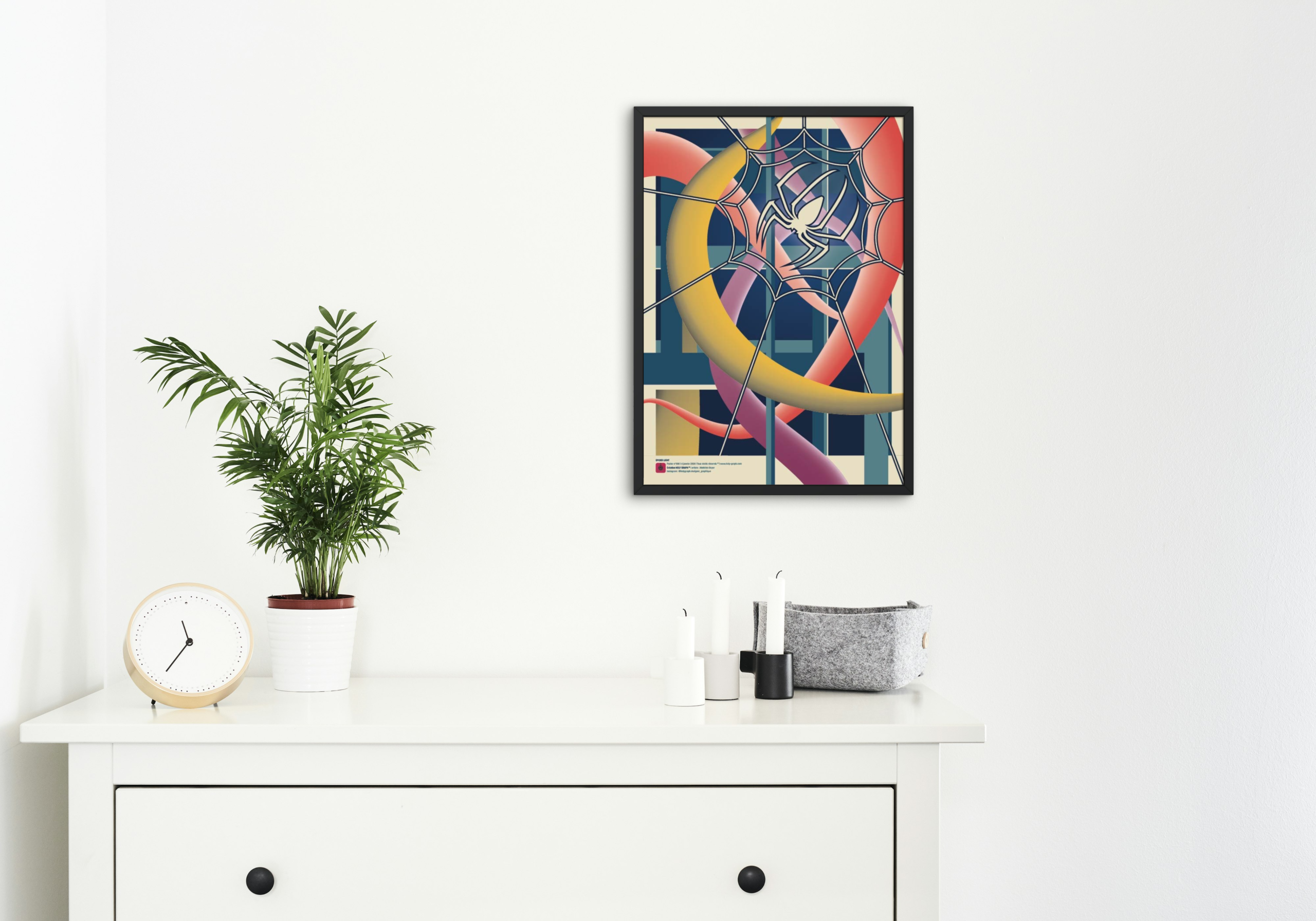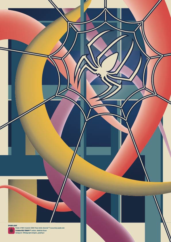 Cette composition graphique explore la tension entre structure et mouvement. Au centre de l’image, une araignée stylisée se tient dans sa toile géométrique, point d’ancrage d’un univers visuel où lignes rigides et formes organiques se rencontrent.